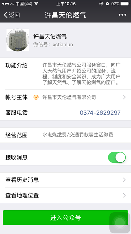 在微信公众号中,选择“许昌天伦”公众号,点击下方“进入公众号”